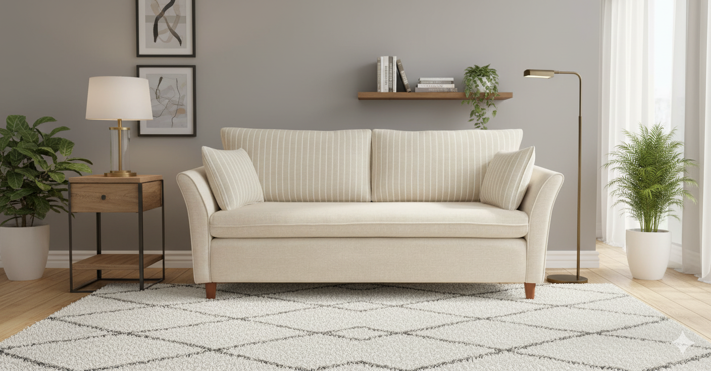 Modelo com almofadas do em encosto em linho rústico jacquard (Listrado).